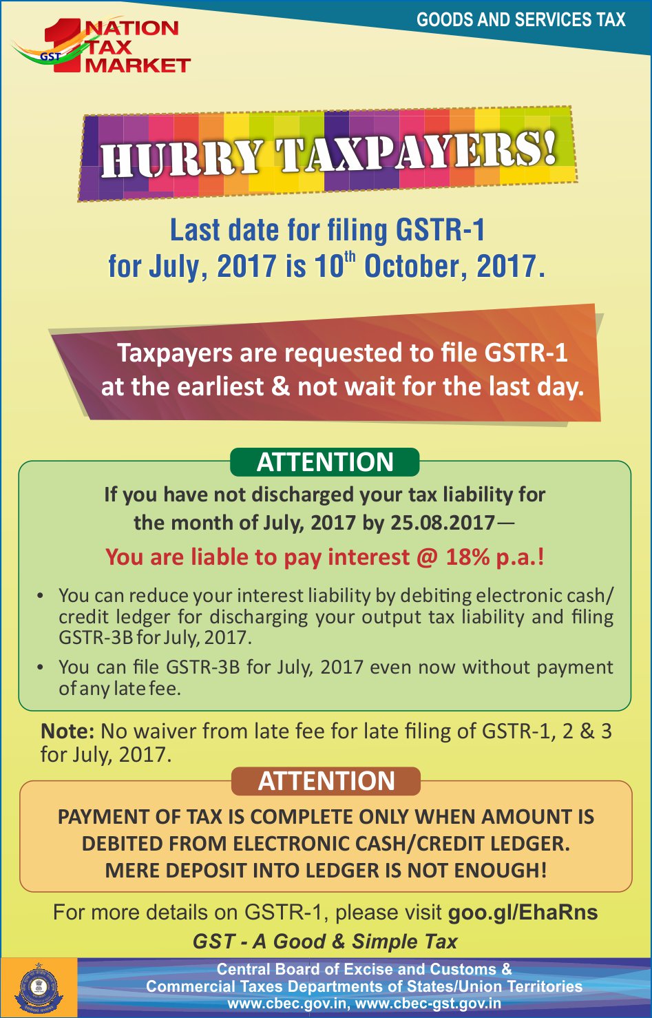 Last date for filing GSTR-1 for July,2017 is Oct 10,2017 Reading Time: < 1 minute Facebook 0 Twitter 0 WhatsApp Pinterest0 Print Email 0Shares